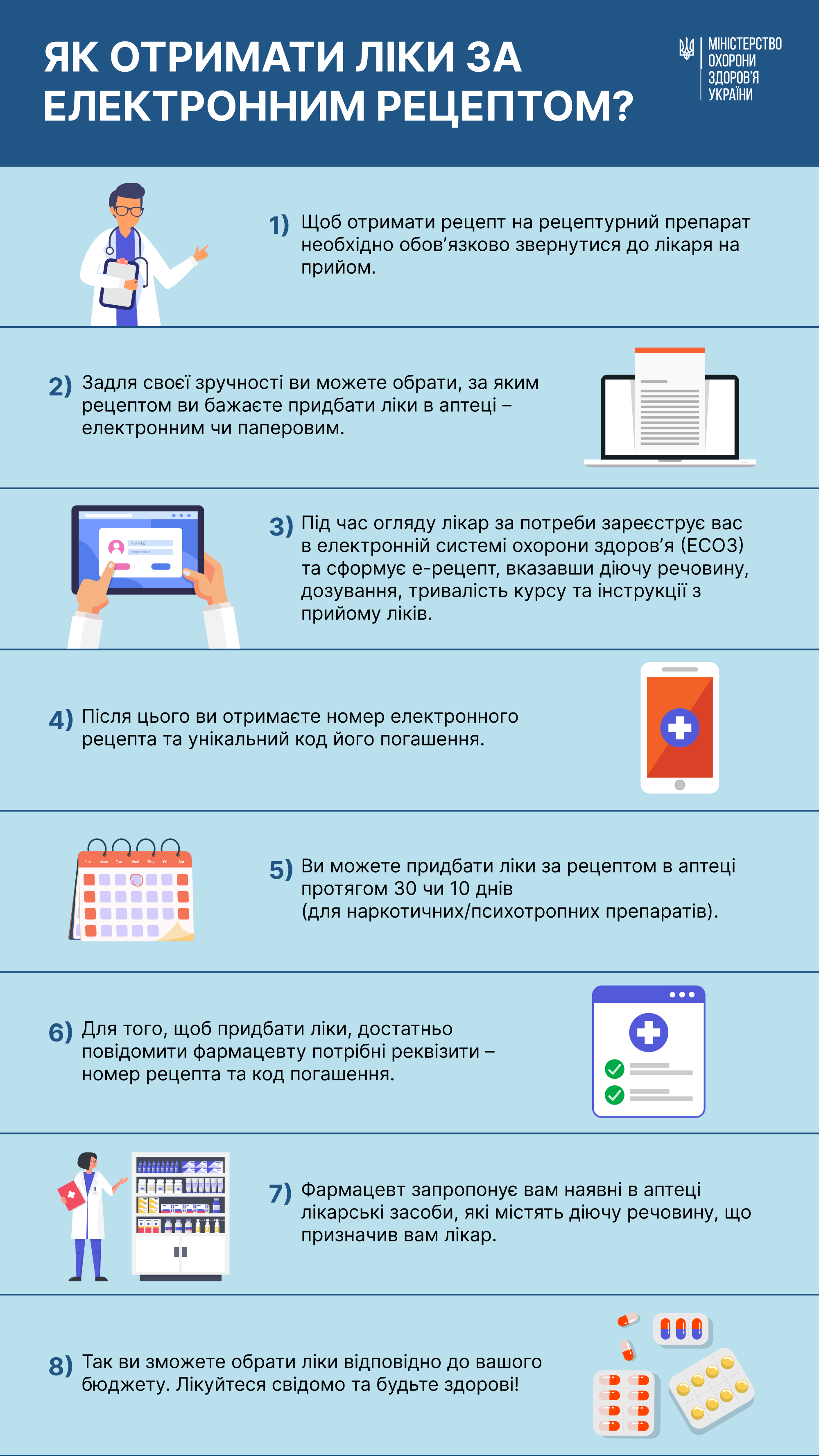 3) Під час огляду лікар за потреби зареєструє вас в електронній системі охорони здоровʼя (ЕСОЗ) та сформує е-рецепт, вказавши діючу речовину, дозування, тривалість курсу та інструкції з прийому ліків.